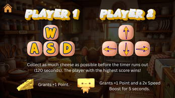 "Cheese Rush! Two hungry rats find themselves trapped in a giant kitchen maze filled with delicious cheese. It's a frantic race against the clock as they scramble to collect as much cheese as possible before the 120-second timer runs out. Who will be the fastest, score the most points, and be crowned the ultimate Cheese Champion?"
